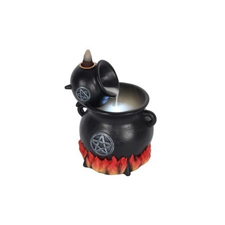 How to use: Place a backflow incense cone on top of this resin cauldron burner and watch the smoke gently pour between cauldrons. Accented by flames and a distressed silver-effect pentagram design and finished with a light to create an outstanding smoke effect. Powered by 2 AA batteries and an on/off switch.